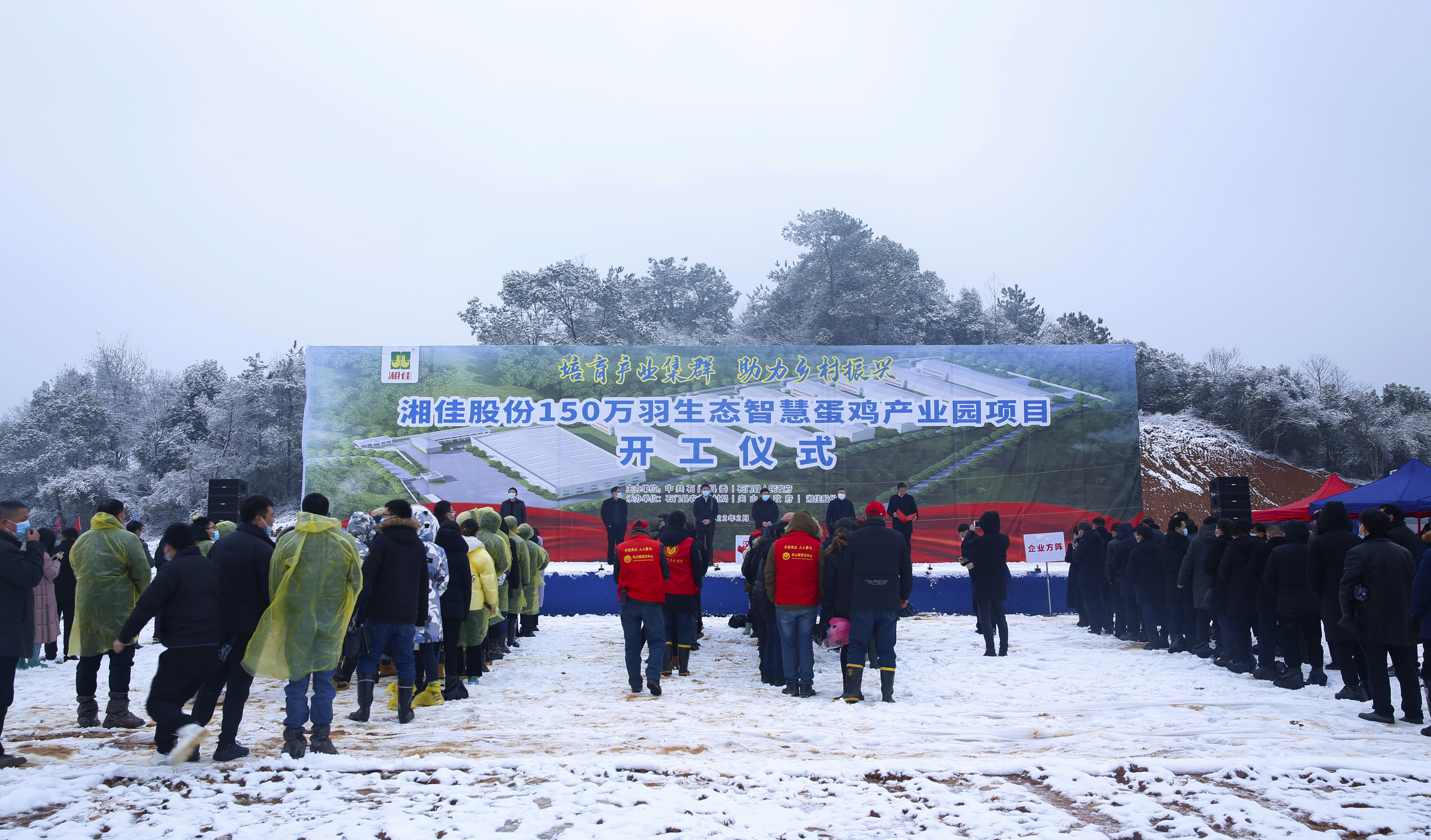 2月18日上午,漫天瑞雪中,湘佳股份150萬羽生態智慧蛋雞產業園項目開工儀式在石門縣夾山鎮漢豐村占家灣舉行,這是湘佳股份全面貫徹落實石門縣委、縣政府提出的“培育五大產業集群”戰略的重大舉措。