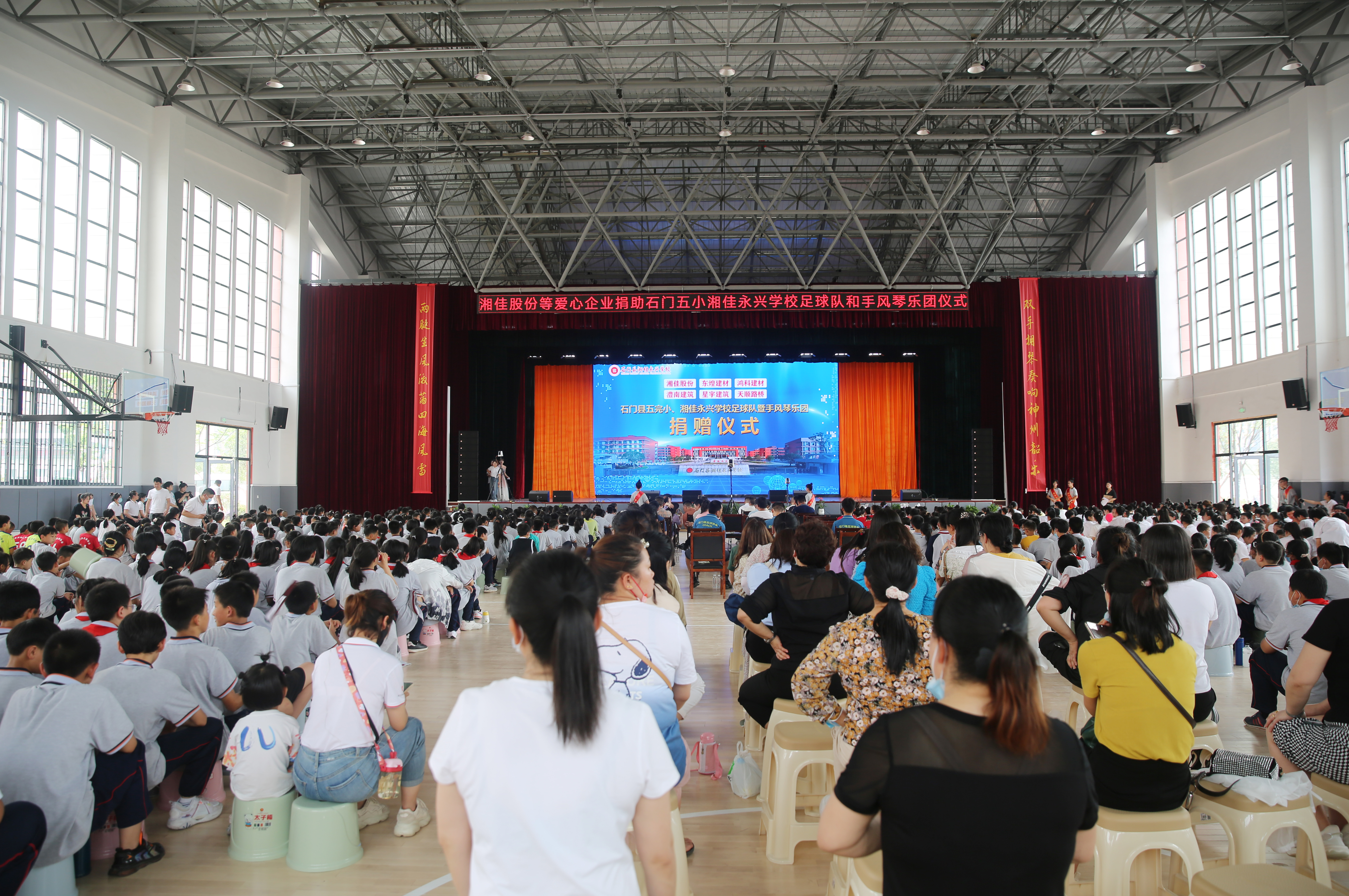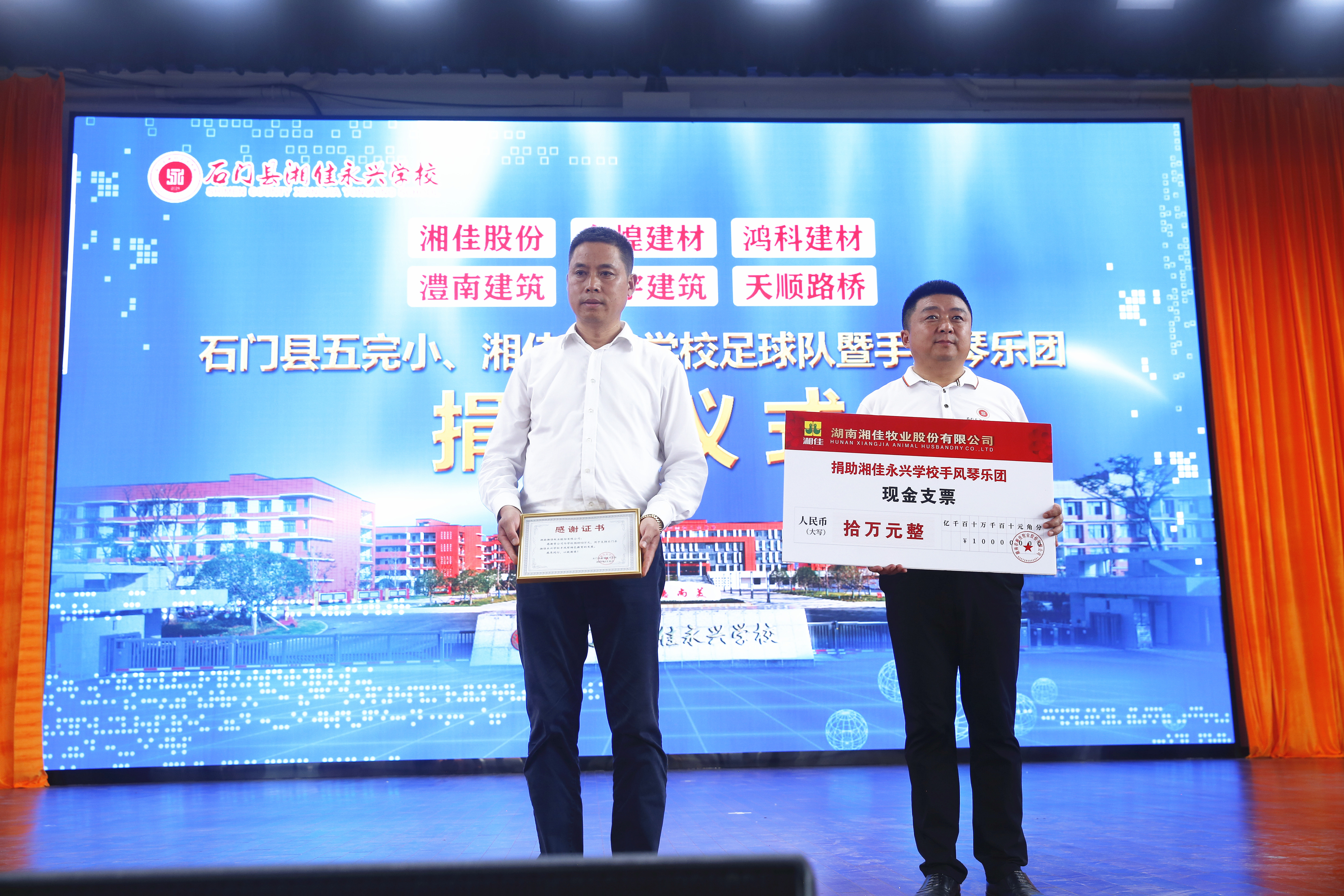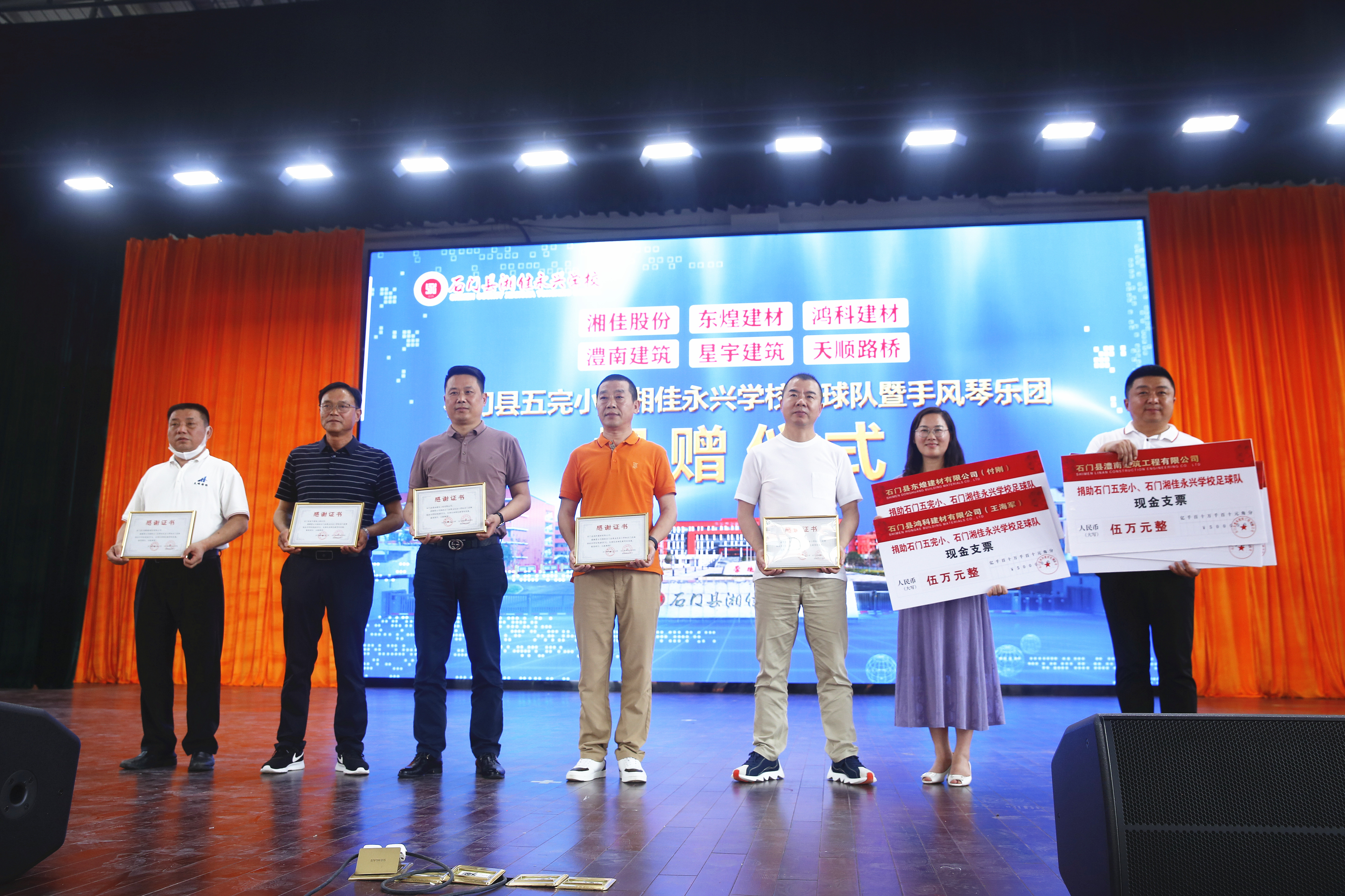 5月30日下午,湖南省石門(mén)縣五完小足球隊(duì)、湘佳永興學(xué)校手風(fēng)琴樂(lè)團(tuán)收到來(lái)自石門(mén)本土上市企業(yè)湘佳股份和石門(mén)本土知名企業(yè)東煌建材、鴻科建材、澧南建筑、星宇建筑、天順路橋捐贈(zèng)的共計(jì)40萬(wàn)元“厚禮”。